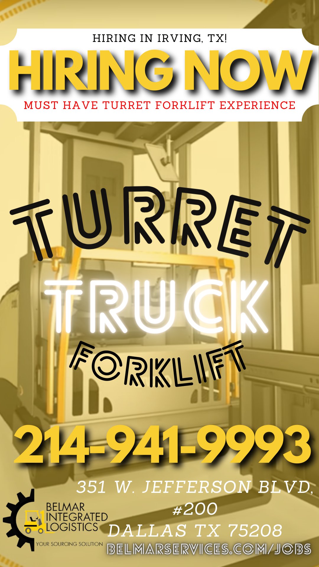 Belmar Integrated On Twitter Warehouse Jobs For You Now Hiring For A Turret Forklift Truck Operator In Irving Tx Apply Below Https T Co Vi9doawzab Https T Co Cqecfqofy9 Twitter